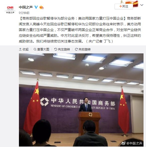 商务部新闻发言人高峰今天针对谷歌这个事情表示,美方动用国家力量打压中国企业,不仅严重破坏两国企业正常商业合作,对全球产业链供应链安全也构成严重威胁。中方对此坚决反对。