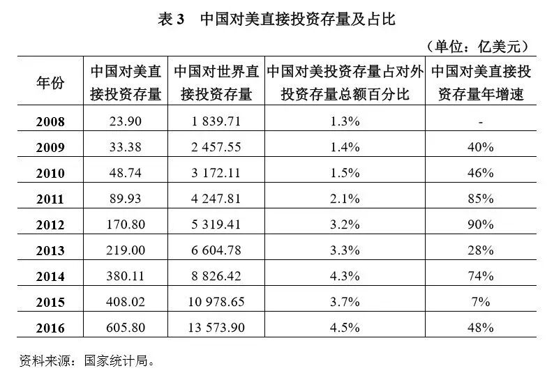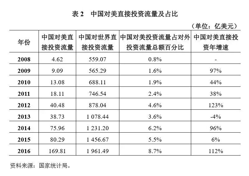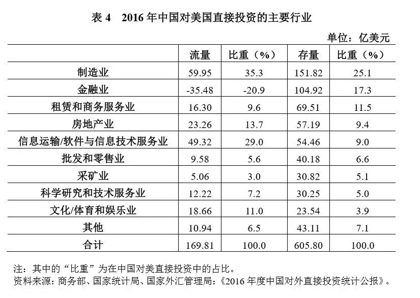 虽然美国是中国对外投资的主要目的地,但由于开始得较晚,中国并非美国最主要的投资来源地,中国对美直接投资在美国吸收外资总量中的占比相对有限。据美国经济分析局统计,2016年,中国对美直接投资流量仅占美国吸收外资总流量的2.26%,而欧盟、加拿大和日本分别为56.87%、11.36%、7.32%;投资存量的差距则更为明显,截至2016年底,中国对美直接投资存量只占美国吸收外资总存量的0.74%,不足日本的1/10。