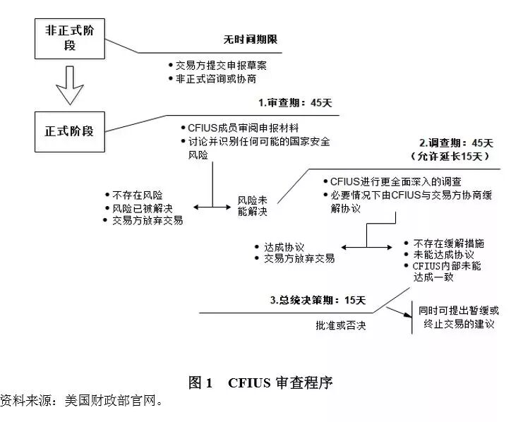 随着《外国投资与国家安全法》等一系列法案的出台,CFIUS的审查程序日趋细致。CFIUS采用逐案审查方式,包括一个非正式协商阶段和三个正式阶段(包括审查期、调查期和总统决策期)。在交易各方提交正式的自愿申报前,皆为非正式阶段,各方可事先与CFIUS进行协商,或者先提交一份申报草案。非正式阶段无时间期限,这一方面为企业争取到了更多与CFIUS成员接触的机会,使其尽早为可能接受的质询作好准备,另一方面也给了CFIUS更充裕的时间进行风险评估,以免在正式阶段被迫延期。