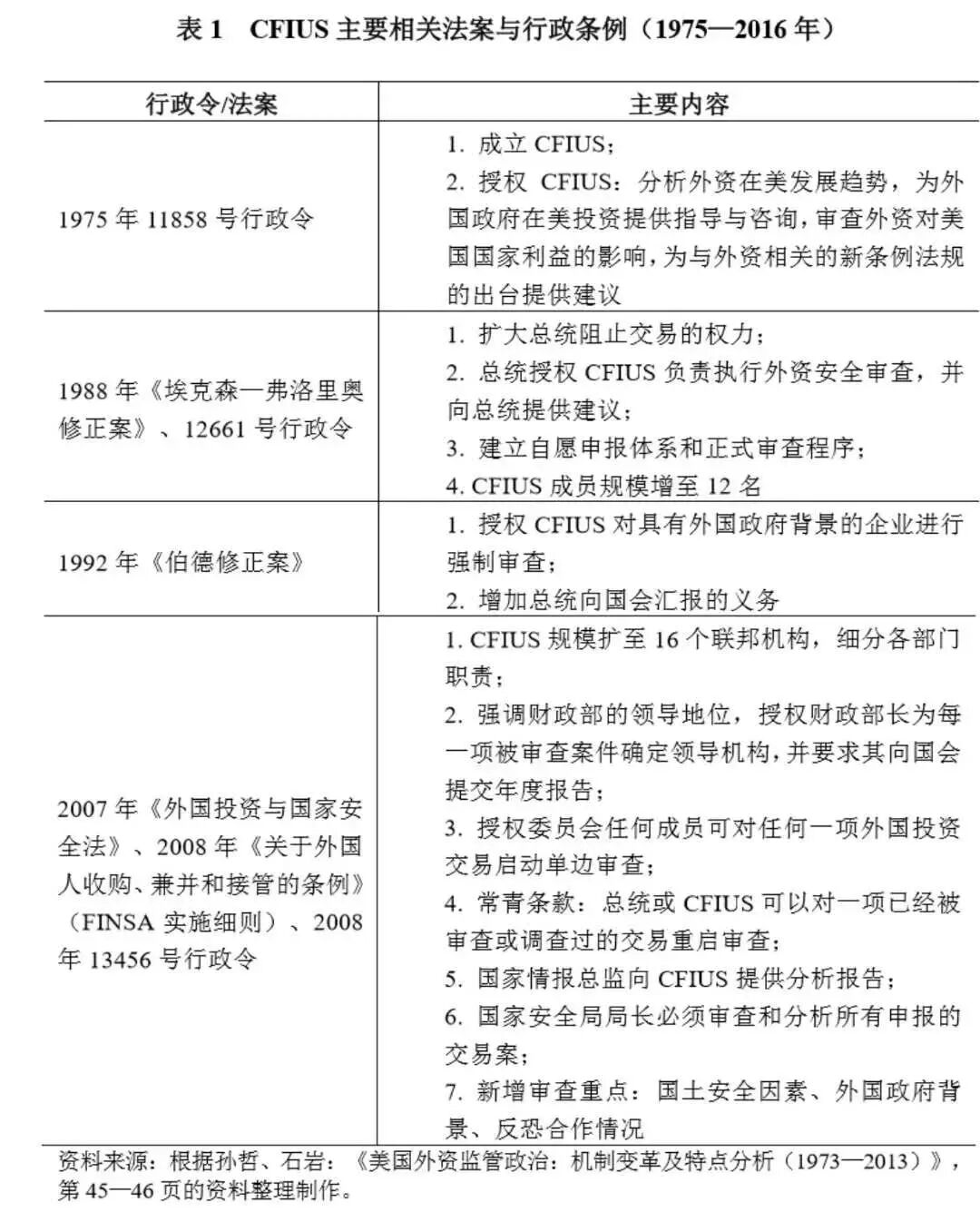 总体而言,伴随着周期性的外资涌入和重大并购案件的出现,美国国会借助国内社会的巨大反弹力量,先后通过一系列法案收紧外资管制和加强自身对CFIUS日常运作的介入。随着CFIUS机构权限不断扩展,美国外资安全审查也日趋严格(见表1)。