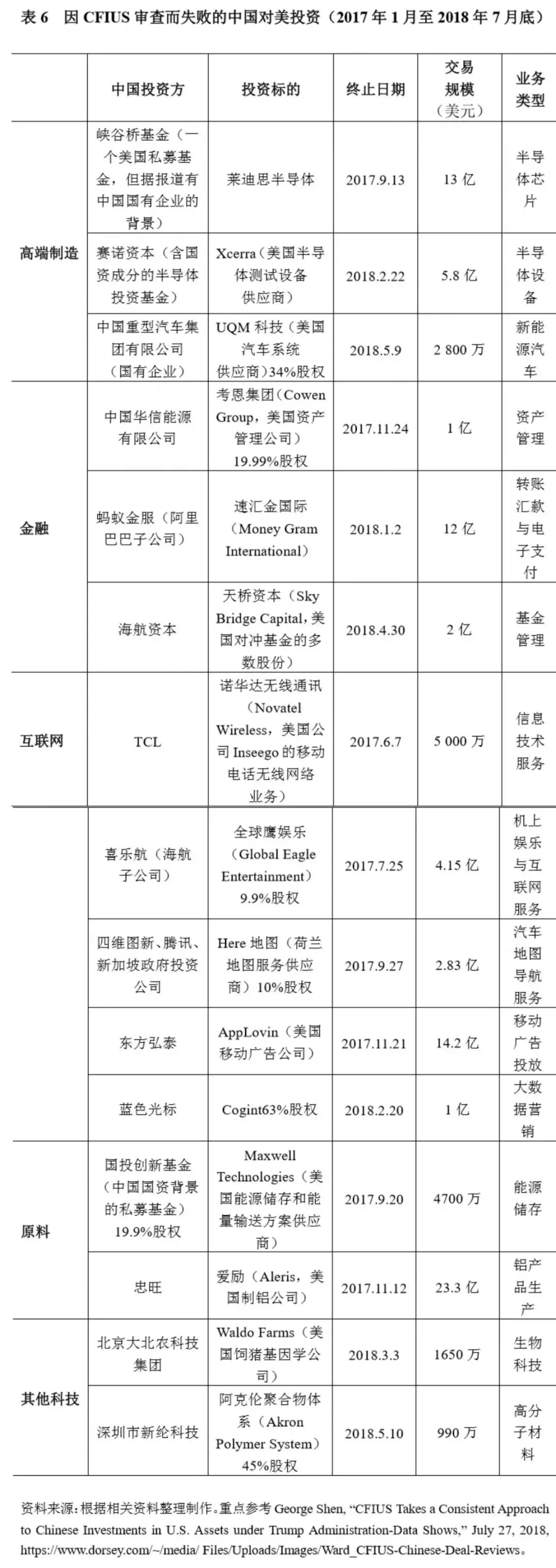 美国频频以国家安全为由对中国对美高科技领域投资活动设限,先进半导体行业与金融服务行业首当其冲。以2017年9月特朗普否决峡谷桥基金(Canyon Bridge)收购莱迪思半导体(Lattice)为例,白宫新闻稿称该交易的国家安全顾虑主要来自四个方面——将知识产权潜在转移给外国收购者,中国政府对此交易的支持,完整的半导体供应链对于美国政府的重要性,美国政府对Lattice产品的使用。然而,交易失败的根本原因在于中美围绕半导体的技术竞争。美国虽然目前在半导体领域明显领先,但仍担忧有朝一日这种技术优势将被“雄心勃勃”的中国取代。在金融服务领域,轰动一时的案件莫过于2018年1月蚂蚁金服在CFIUS阻挠下放弃收购美国速汇金一案,除了涉及敏感数据,这起案件的失败还由于互联网金融服务属于新兴高附加值产业,是中美技术竞争的焦点之一,美国不愿本国先进的汇款技术轻易被蚂蚁金服引进(见表6)。