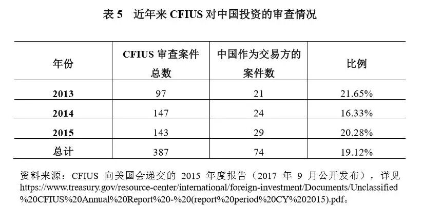 近年来,中国日益成为美国国家安全审查的重点对象。CFIUS的2015年度报告显示,涉及中资的案件数在CFIUS年度审查案件总数中的占比在2015年连续第四年位居首位。美国历史上共发生过5次由总统亲自否决一项外资交易的情况,而这5起案件全部与中国相关。自2017年特朗普上任至2018年7月底,CFIUS频频以国家安全为由阻碍中国并购美国企业,共有十多项投资交易因此流产,并且主要集中在半导体、信息通讯、金融服务、大数据、新材料等新兴高科技领域,例如,2017年6月TCL收购诺华达无线通讯(Novatel Wireless),2018年1月蚂蚁金服收购速汇金(Money Gram),2018年5月新纶科技收购阿克伦聚合物体系(Akron Polymer System),等等(见表5)。