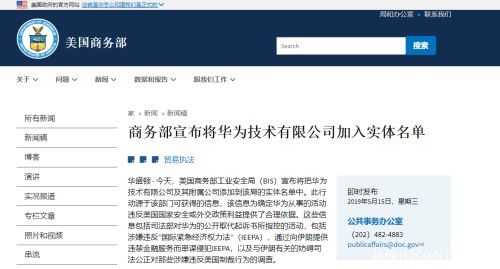 2019年5月15日,美国商务部工业安全局(BIS)宣布将把华为技术有限公司及其附属公司添加到该局的管制实体名单中。