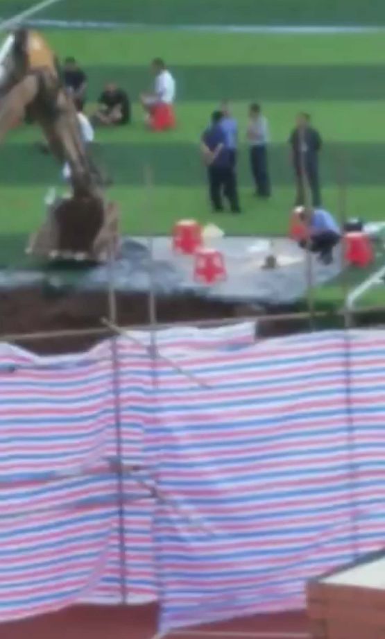 新晃一中体育场跑道的一个角落被高高的编织布围了起来,轰隆隆的机器声中,20日0时许,一具早已化为白骨的尸体被挖了出来。
