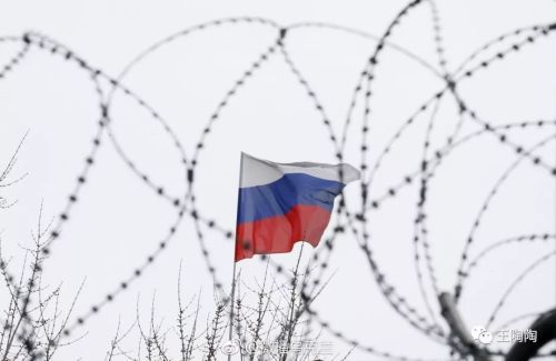 乌克兰内战前线铁丝网之后的俄罗斯国旗,象征着欧洲的分裂