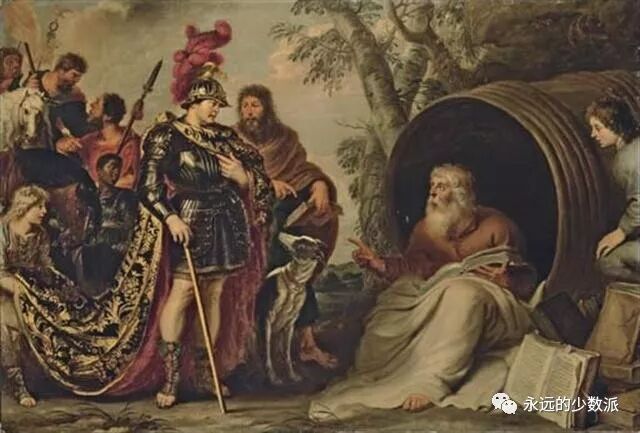 就是这位著名的第欧根尼,“大白天举着一盏灯四处走动说‘我在找一个诚实的人’”。他的生活细节很是粗略,只有一个大概。他原是锡诺普(希腊在黑海上的殖民地)的一个庄家,但他似乎陷入了假钱风波,而被他的家乡放逐。在远航埃伊纳岛的路上,他被海盗抓获,卖到克里特岛为奴,在那之后,他成为一名哲学家。我们被告知,在拍卖场,他看到人群中有一个衣冠楚楚的买家,就说:“把我卖给那个男人。他需要一个主人。”当他的朋友们想要用赎金赎回他,他拒绝了这个提议,他说:“狮子永远都不会是那些喂养它们的人的奴隶。”于是,他就成了科林斯岛一个大户人家的管家;他把家里家外管理得是如此之好,以至于他的主人“见人就说,一个善神[daimon]住在我家”。