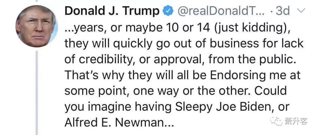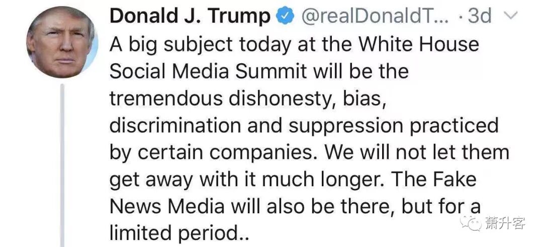 当天早上,川普总统就下午的“社交媒体峰会”发推特剧透:今天白宫社交媒体峰会的重要主题将是讨论某些公司存在的巨大的不诚实、偏见、歧视和压制问题。我们不会让他们一直逃避这个问题。在一段有限的时间内,假新闻不像社交媒体那样重要或强大。自2016年11月,我和那位成为第一夫人的人一起乘坐自动扶梯下来那天起,假新闻便失去了巨大的信誉。当我6年后最终总统卸任时或者10或14年后(开玩笑),假新闻将因缺乏公众的可信与认可度而迅速破产,这就是为什么他们都会在某种程度上支持我,无论如何,你可以想象让昏昏欲睡的乔拜登,或阿利佛.雷德纽曼,或如此紧张和脆弱的宝嘉.康蒂-印第安人的版本(1/1024的血统)的人作为你的总统,而不是你现在已经拥有的,如此潇洒,聪明,真正的具有天赋的总统!很遗憾地说,即使是社交媒体也会与最终的假新闻媒体一起被淘汰出局!