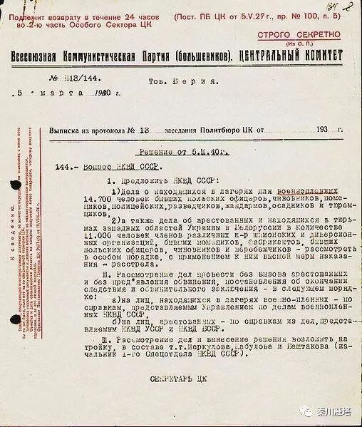 1990年4月13日,戈尔巴乔夫在克里姆林宫的官方仪式上向雅鲁泽尔斯基递交了2份厚重的文件,一份是贝利亚1940年3月5日下达的枪决命令以及受害者名单。另一份是苏共中央政治局会议纪要,所有的政治局委员伏罗希洛夫、莫洛托夫、米高扬、卡冈诺维奇都在上面签字,并且有清晰的斯大林签名。