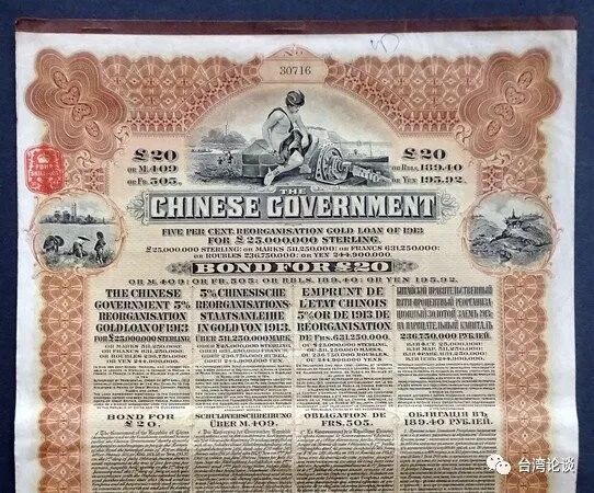 台媒报道称,因为北洋政府在1913年用以维持政府运作,而向英、法、德、俄、日借来的“善后大借款”,最后这笔债权由国民政府偿还至1939年,因对日抗战,无力偿债而终止还债。