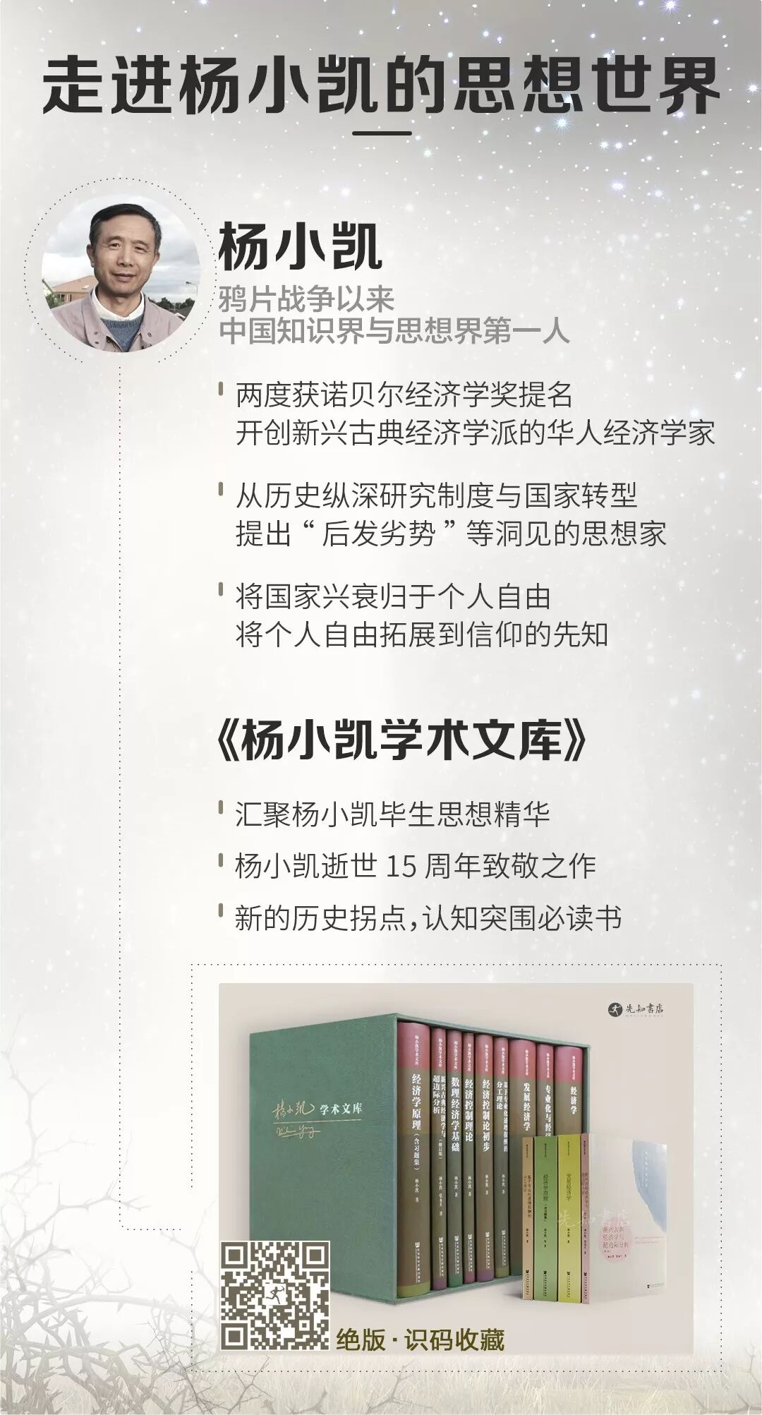 为何会出现 “杨小凯现象”?熟悉杨小凯的人,通常会总结为三条:· 传奇的人生经历:18岁那年,杨小凯因一篇“中国向何处去”被捕入狱,但他却将牢狱变成了“大学”,自学成才。出狱后,几经波折赴美深造,终成首位开宗立派的华人经济学家。· 三大原创性贡献:杨小凯在短短26年学术生涯内完成“三次范式革命”:“新兴古典经济学”的开宗立派,以及“后发劣势”“信仰是制度的第一因”的洞见。前者让他成为最接近诺奖的华人经济学家,后两者正在成为先知般的预言。· 独具魅力的人格:杨小凯出身高干家庭,却关心底层疾苦,尤其反感把人分为三六九等的制度与文化;他桀骜不驯,待人却谦卑随和;谈及学术他口若悬河,但在言及自己时,却不善言辞;与人合作研究,合作者最后发现主要贡献均属于杨小凯,但他却坚持自己的名字应该署在后面,无论合作者是大学者,还是他那些名不见经传的学生......