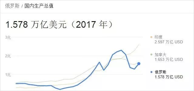 来看看俄罗斯这些年GDP的走势吧,你就知道经济情况有多糟了。GDP已经跌到了1.578万亿美元了,跟中国的广东省差不多的水平。