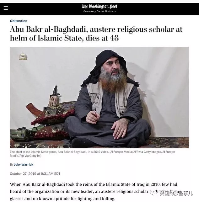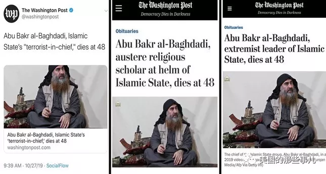 《华盛顿邮报》对此事报道的标题:执掌伊斯兰国的严肃宗教学者巴格达迪,终年48岁(Abu Bakr al-Baghdadi, Austere religious scholar at helm of Islamic State, dies at 48)。”引起一众哗然。