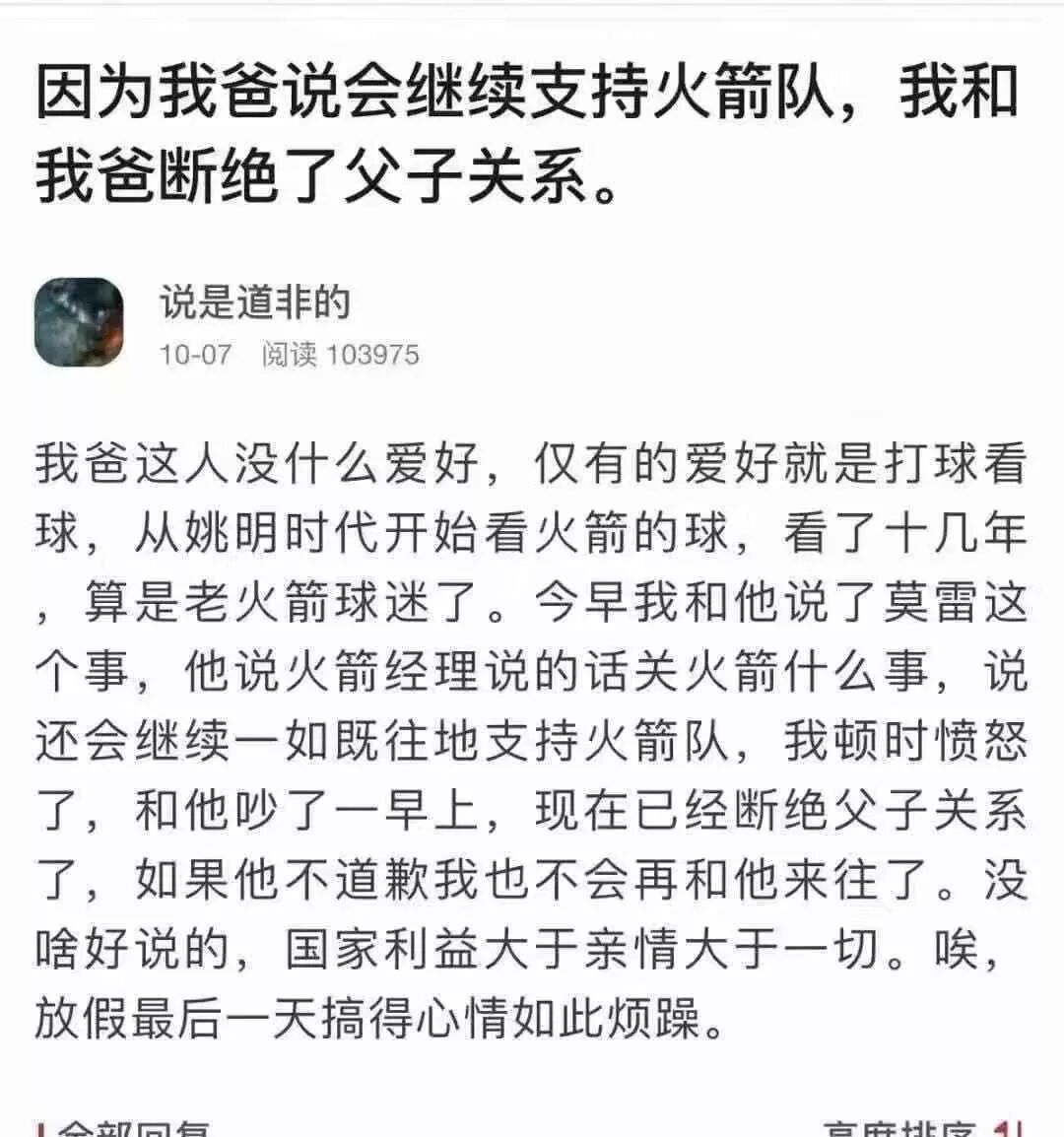 更可怕的是,抵制NBA的浪潮掀起了中国普通人内心的戾气,甚至网上还流传出一对父子断绝关系的案例,而发帖人还自豪无比、信誓旦旦。
