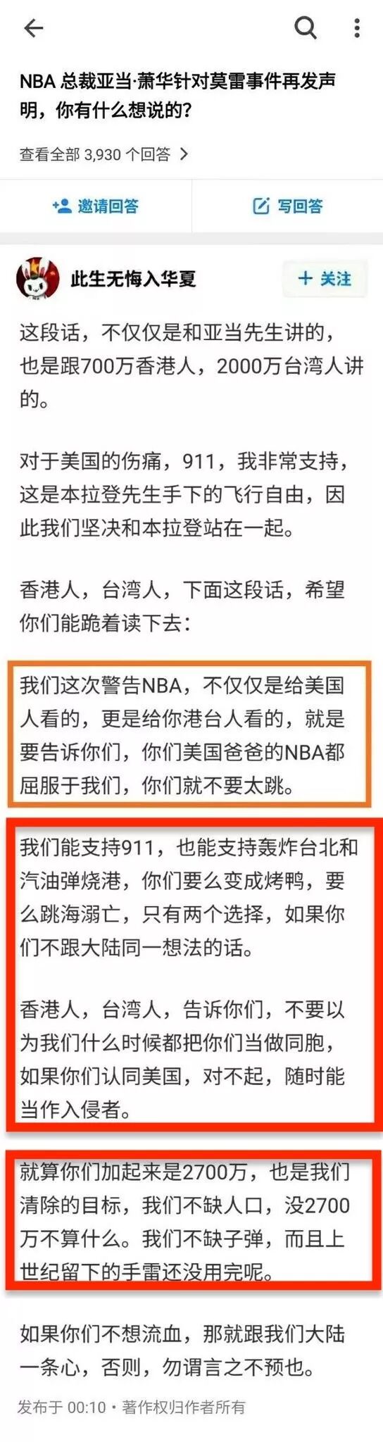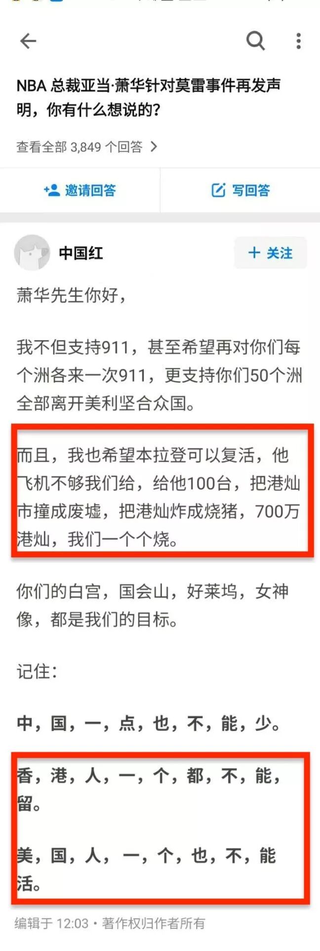 更有人在知乎上表示,要再来100次911,还要杀光香港人和美国人。如果他们是实名用户,这样的言论被其他各国政府机构知道了,他这辈子可能都无法出国了,在中国可能也会列为黑名单。