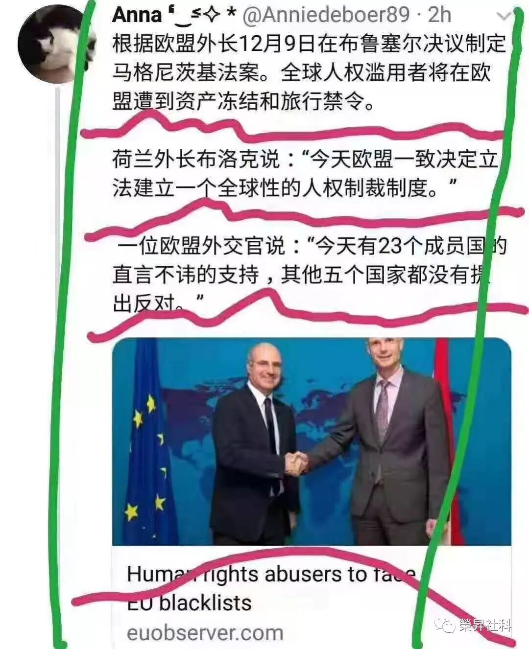 荷兰外长布洛克说:“今天欧盟一致决定立法,建立一个全球性的人权制裁制度。”另一位欧盟外交官补充说:“今天有23个成员国直言不讳地支持,其他五个国家都没有提出反对(意见)。”