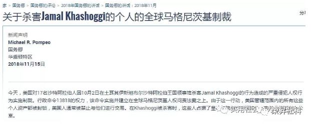 目前,除了俄罗斯,美国已就违反该法案的其他国家人员进行了几起制裁行动;比如2018年发生的,轰动全球的沙特前记者卡舒吉被虐杀案,美国启动了对参与制造卡舒吉惨案的,包括沙特王储的高级顾问卡赫塔尼等有关人员实施了制裁。