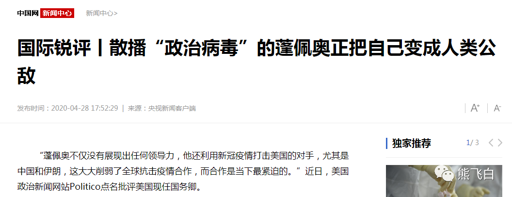 “散播‘政治病毒’的蓬佩奥正把自己变成人类公敌”