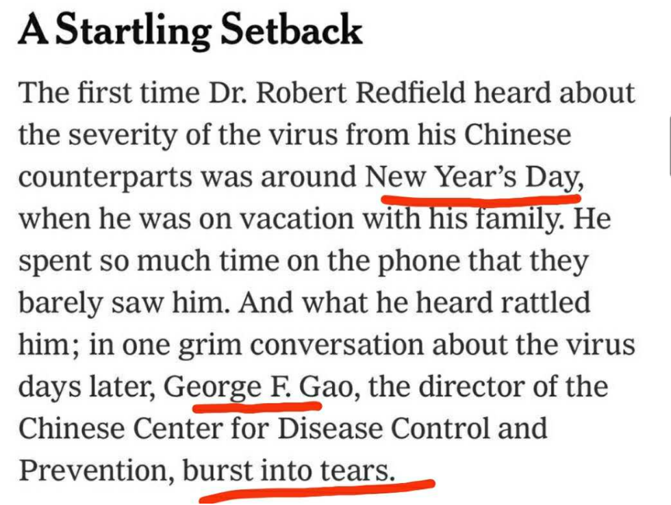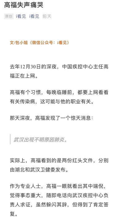 这几天,纽约时报一则消息引人注意——元旦之后两天,在与美国疾控中心主任通电话时,谈及武汉疫情,高福在电话里哽咽失声痛哭。