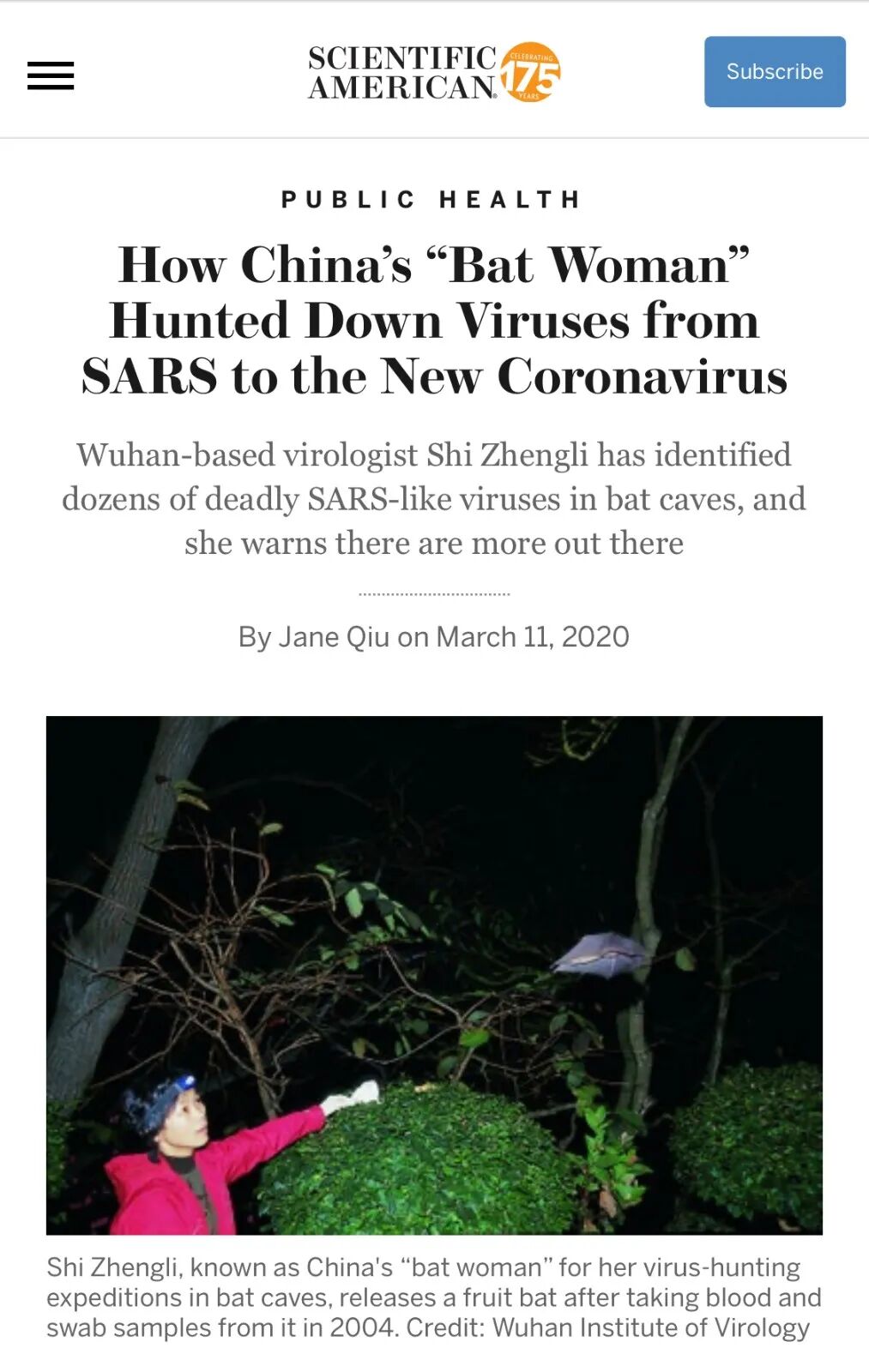 How China’s “Bat Woman” Hunted Down Viruses from SARS to the New CoronavirusWuhan-based virologist Shi Zhengli has identified dozens of deadly SARS-like viruses in bat caves, and she warns there are more out there