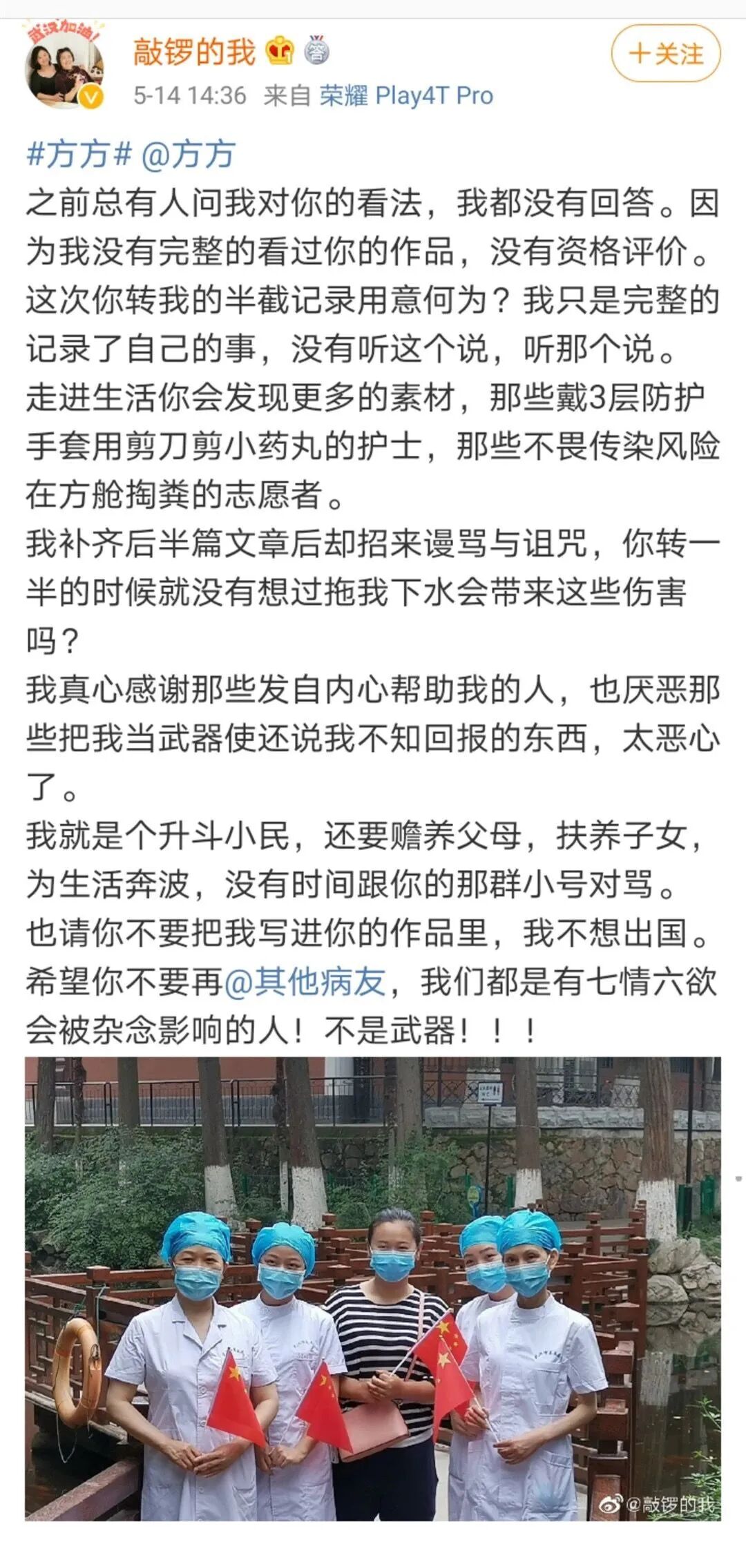 因为方方的记录和太多热心人转发你的敲锣声,你成了网红“敲锣的我”,所以你妈妈得救了。你感谢护士,感谢医生,感谢ZF,感谢社区,感谢志愿者,感谢了你所有的左邻右舍,这都没错。没有一个人转发你的敲锣声是为了得到你的感谢,没有,我相信一个也没有。但是,我更相信,没有一个转发你声音的的人尤其记录你声音的方方,做了一丝丝准备接受你突然翻脸不认人跳起来反咬一口。