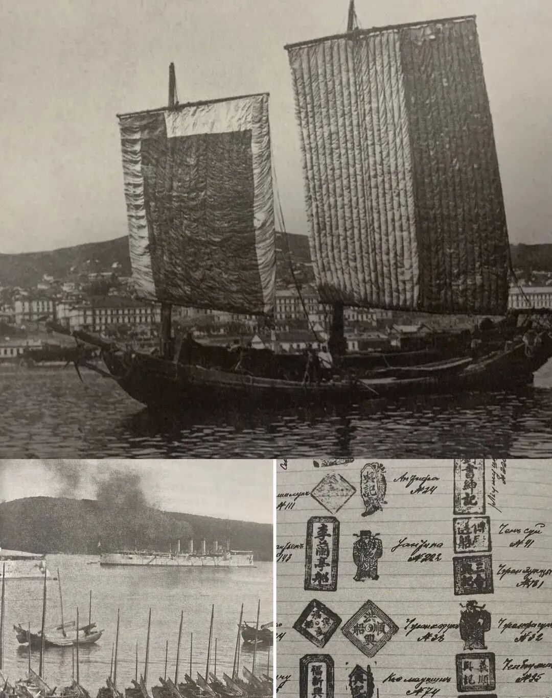 根据笔者在海参崴的考察,20世纪初,海参崴最主要的商业街道和最繁华的城区,的确相当部分为华人所拥有。像今天海参崴最重要的商业步行街——阿列乌茨克大街、斯维特兰娜大街、海军元帅福金街的大量商业楼属于蔡氏、邰彩玲、李立浩等有实力的华商。(海参崴中心商业街上的华人房产,图二为蔡氏的商行,图三为邰文忠承建的剧院,后来成为内务部俱乐部,可以推测,30年代很多对华人的驱逐和镇压都是在这里策划的)另一位传奇的华商纪凤台,1901年就投资20万卢布(购买力约相当于现在的5500万人民币)建立起海参崴最大商行之一的K商行,日俄战争中,他组织了1500辆大车、6000匹骡马的运输队协助俄军保障后勤,可见其控制财富的体量。此外,中国人还控制着远东的近海运输和黑龙江内河航运,1910年前后,海参崴港口注册的600多艘商船中,多数为中国人所拥有,这些商船载重量不大,一般在50吨左右,但是中国人凭借价格低廉的优势,使得俄国企业家长期在市场竞争中,无法染指这个行业,直到沙俄国家杜马禁止外国人在远东从事近海运输为止。(金角湾里的华人商船,以及华工的印章,来源:米兹《中国人在海参崴》)总的来说,在帝俄时代,华人与俄罗斯人一同合作开发了远东地区,俄罗斯人是统治者,控制着军政大权和金融、矿产等命脉行业,而华人则在一般性行业占有优势地位,这与南洋地区欧洲殖民者与华人合作的模式有很大相似性。华人在人口上的庞大占比,也跟英属的东南亚地区人口结构很相似。如果没有第一次世界大战和十月革命改变历史进程,华人可能还会持续不断往这个地方移民,并且以后成为这个土地上生活的主要族群之一,海参崴也或许会成为东北亚的新加坡。1917年的十月革命给华人带来了希望,布尔什维克主张人人平等,废除压迫制度。华人在远东虽然生活的还可以,比国内的同胞好,但是地位明显不如这里的欧洲人。华人开始积极参加革命,希望与布尔什维克一起推翻旧的反动统治,用自己的努力获得新生。正如上乌金斯克华人代表大会向苏维埃新政权的信中说的那样: