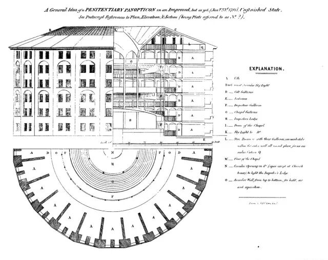 全景敞视的监狱剖面图,囚犯既被空间所困,