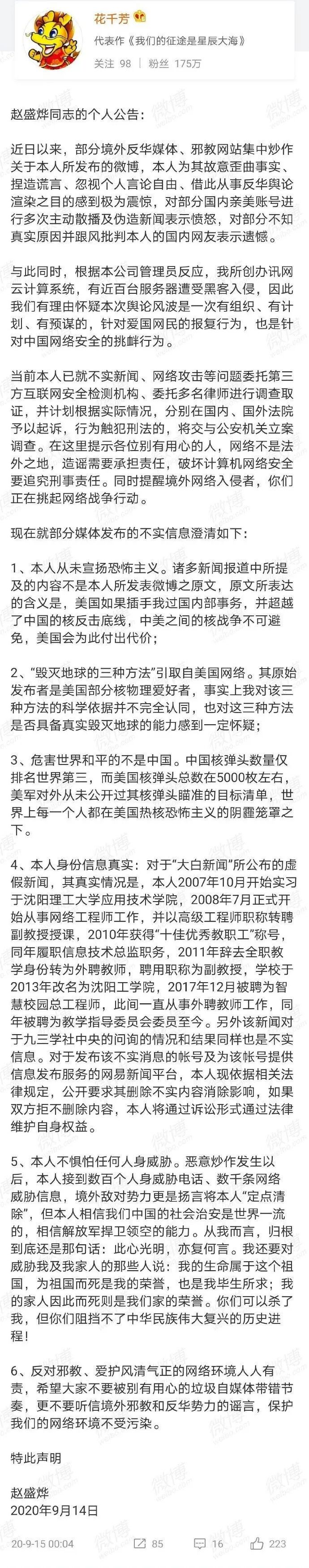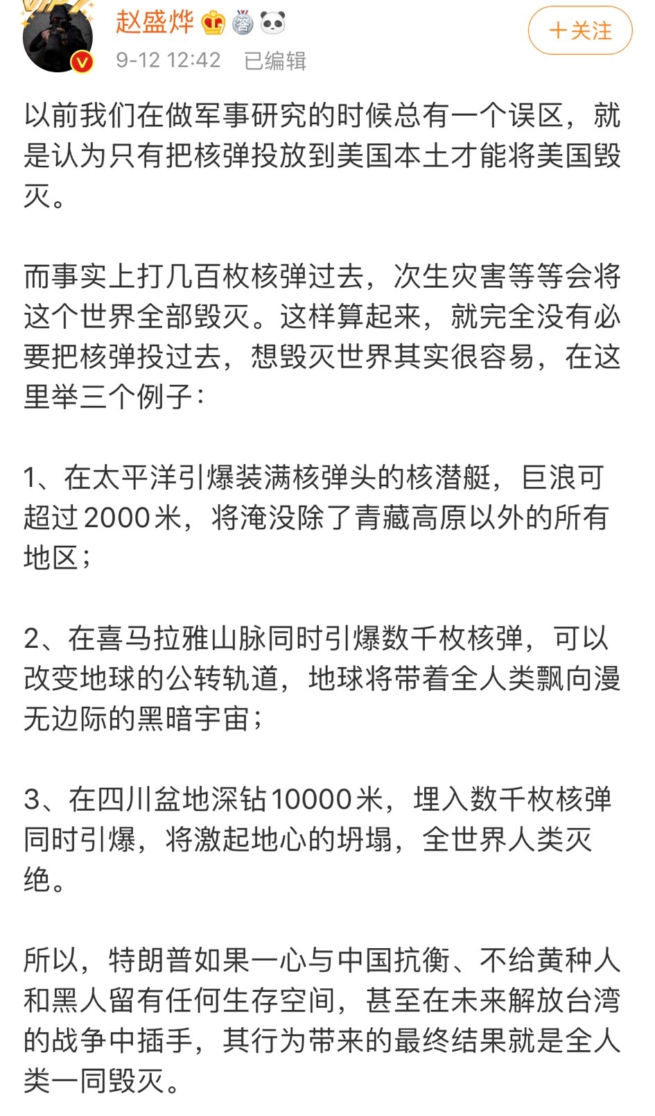 赵盛烨这两天忽然走红,起因是他发表了一套通过核武器毁灭地球全人类的方案。按照这个方案,不需要把核武器扔到美国,就可以毁掉美国和全世界。