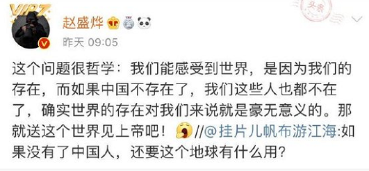 赵盛烨毫无疑问认为自己是一个爱国者,虽然别的爱国者可能不屑与他为伍。有几万人给他这个idea点赞。可见中国还是有不少赵盛烨这样的勇士。
