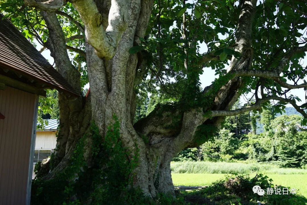 村里有一颗日本最大的荷叶树,周长10.7米,树龄600年。