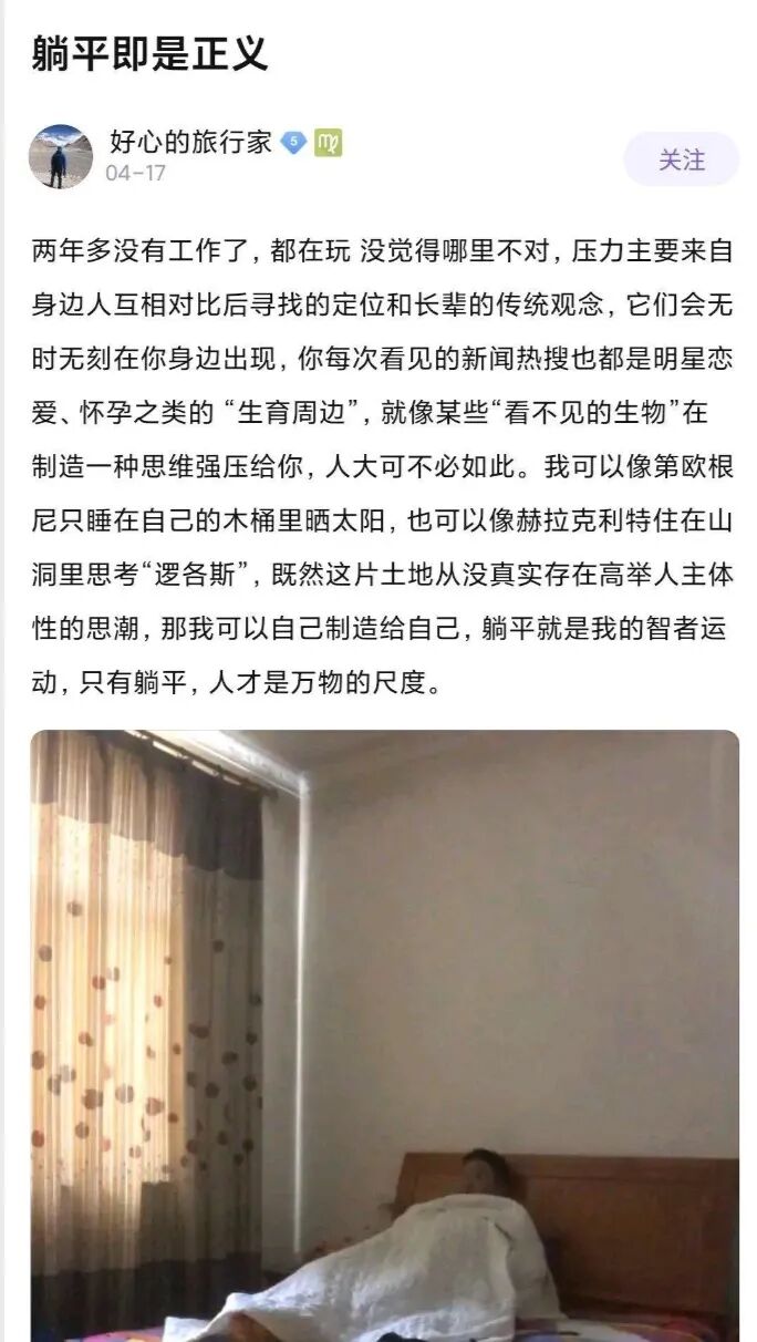 网友“好心的旅游家”发表帖子《躺平即是正义》,言语间充满了哲思。
