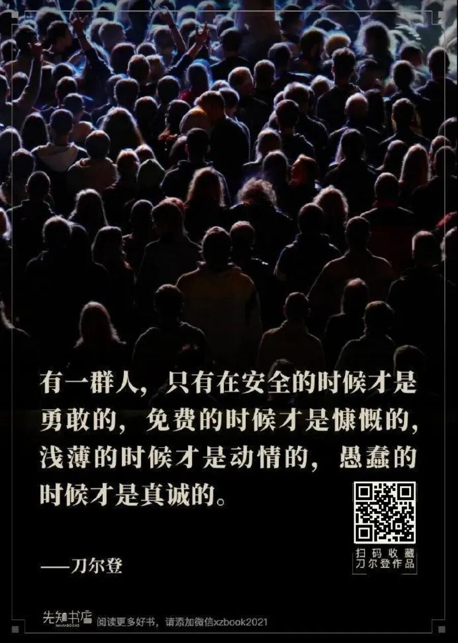 刀尔登先生的文字从西方经典到中国文化古书,从中国史到西方文化,人性与自我、思想与自由,天南海北无所不谈,角度睿智独到,属读过就不能忘记那种。遗憾的是,他的书有的曾绝版多时,有的又散乱各处。 为此,先知书店鼎力推荐"刀尔登作品集"(含签名版)。在这个语言堕落、思想浅薄的时代,用刀尔登的文字抵御有毒语言的侵害,做个坚持独立思考的少数者。识别下图二维码,即可一键收藏(共6本,《大道和小道》有签名版)。