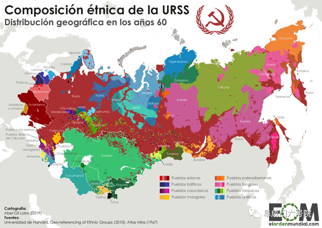其实,在帝国时期,俄罗斯境内多数民族都是混居的状态,人们并没有自己的民族"疆界"意识,大家并不知道自己的边界在哪。比如,境内第二大民族乌克兰人是在18世纪以后才形成的,他们从来没有建立过国家(基辅罗斯与乌克兰并没有关系),俄罗斯帝国境内也没有"乌克兰"这个地方,然而,苏联政府为乌克兰人划定了民族的边界,并制造了"乌克兰"这个地理疆界概念。到二战前,苏联一共创造了15个加盟共和国、20个自治共和国、10个民族特区、8个民族自治州,将作为整体的俄罗斯解体为复杂的民族区域马赛克拼图。