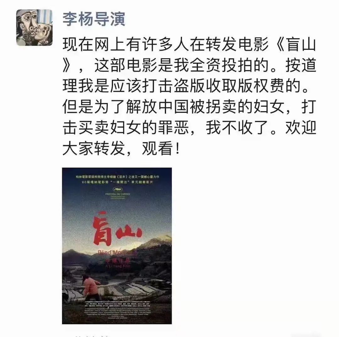 2月5日,电影《盲山》的导演李杨在朋友圈发布了一条声明:“现在网上有许多人在转发电影《盲山》,这部电影是我全资投拍的。按道理我是应该打击盗版收取版权费的。但是为了解放中国被拐卖的妇女,打击买卖妇女的罪恶,我不收了。欢迎大家转发,观看!”