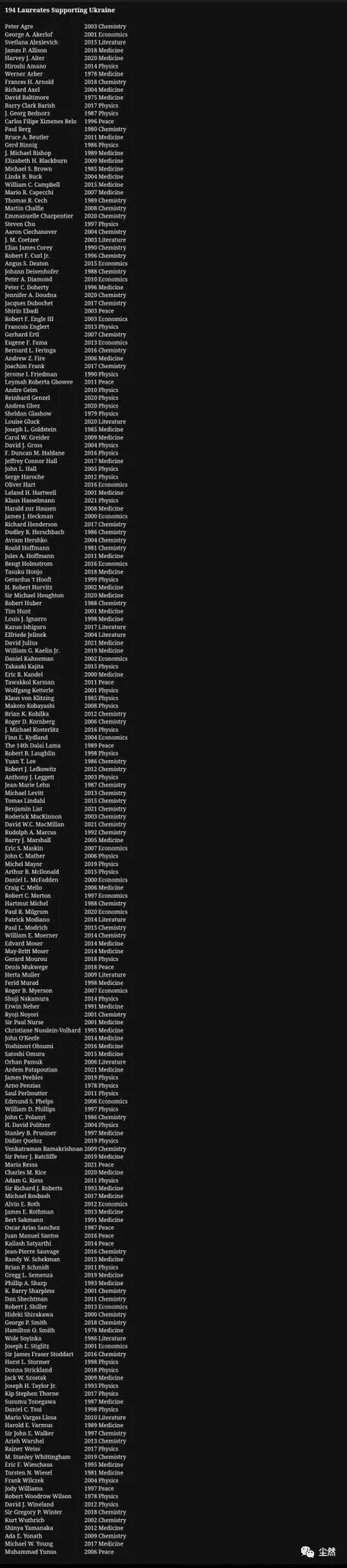 194名诺奖获得者联名谴责俄国入侵乌克兰的公开信签署全名单