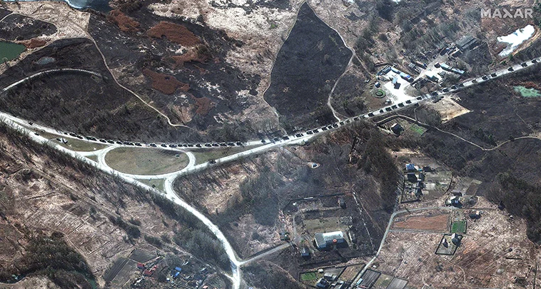 前三天进攻不利后,卫星图像显示,一支绵延约64公里的俄罗斯军队在乌克兰北面向首都基辅行进。但过了几天,车队并没有前进多少,原因是车队拥挤、燃料不足和车辆故障导致车队步履蹒跚。后果如此严重,连食物的供应都困难,有的车辆无线电都不能使用了。