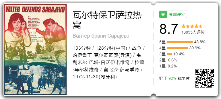 《瓦尔特保卫萨拉热窝》1972年在南斯拉夫上映,1973年,北京电影制片厂译制该片, 此后在80年代公映,并成为国人的一代经典。