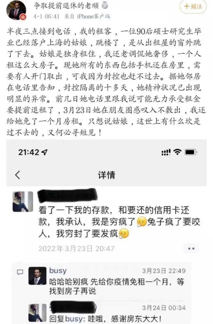 我想肯定还会有更多不为人知的悲剧,前几天一个上海房东的朋友圈引发网络关注。他的一名房客因为长期封禁,在他答应免除一个月房租的情况之下,依然入不敷出。最终穷途末路,以跳楼的方式,决然离去。这样一个花样年华的女研究生,谁该为她的死负上责任? 很多人说防疫总是要付出代价的,他们把上海人付出的牺牲,理所当然地视为抗疫政策的必然代价。这种高深的诡辩确实是让人难以反驳,就像你无法跟畜生共情一样,因为它们身上委实不具备人性。
