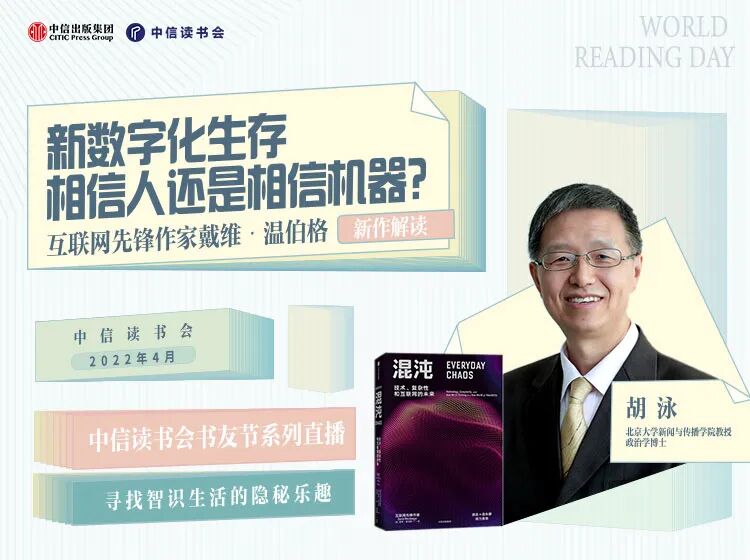 4月12日19:00,中信读书会邀请北京大学新闻与传播学院教授、政治学博士胡泳做客大咖直播间,聚焦互联网从底层逻辑上带来的认知重塑,与大家共同思考互联网的未来。
