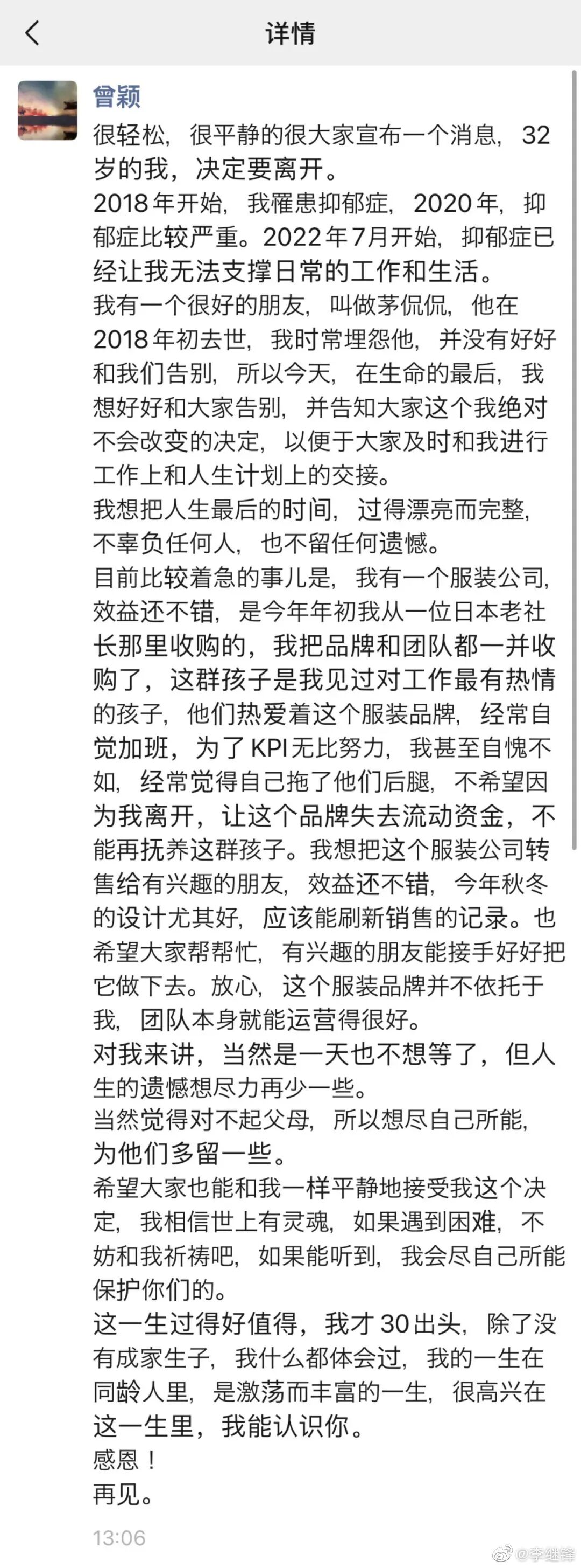7月19日下午14点,曾颖在朋友圈发出这样的信息:"很轻松,很平静地向大家宣布一个消息,32岁的我,决定要离开。"