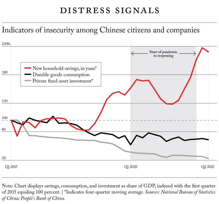 相较于偏离目标的一种典型的过分乐观预测,这一逆转更为要紧。中国的耐用品消费和私人部门投资率都已降至先前水平的几分之一,加上家庭储蓄率飙升,都昭示了问题的严重性。那些趋势从整体上反映了民众的长期经济决策,而且它们有力地表明,在中国,民众和企业越来越担心失去财产权,且看重短期流动性胜过投资。这些指标没有恢复到新冠疫情前的正常水平,更不用说像在美国和其他地方那样在经济重新开放后呈现繁荣态势,这昭示了一些深层次问题。