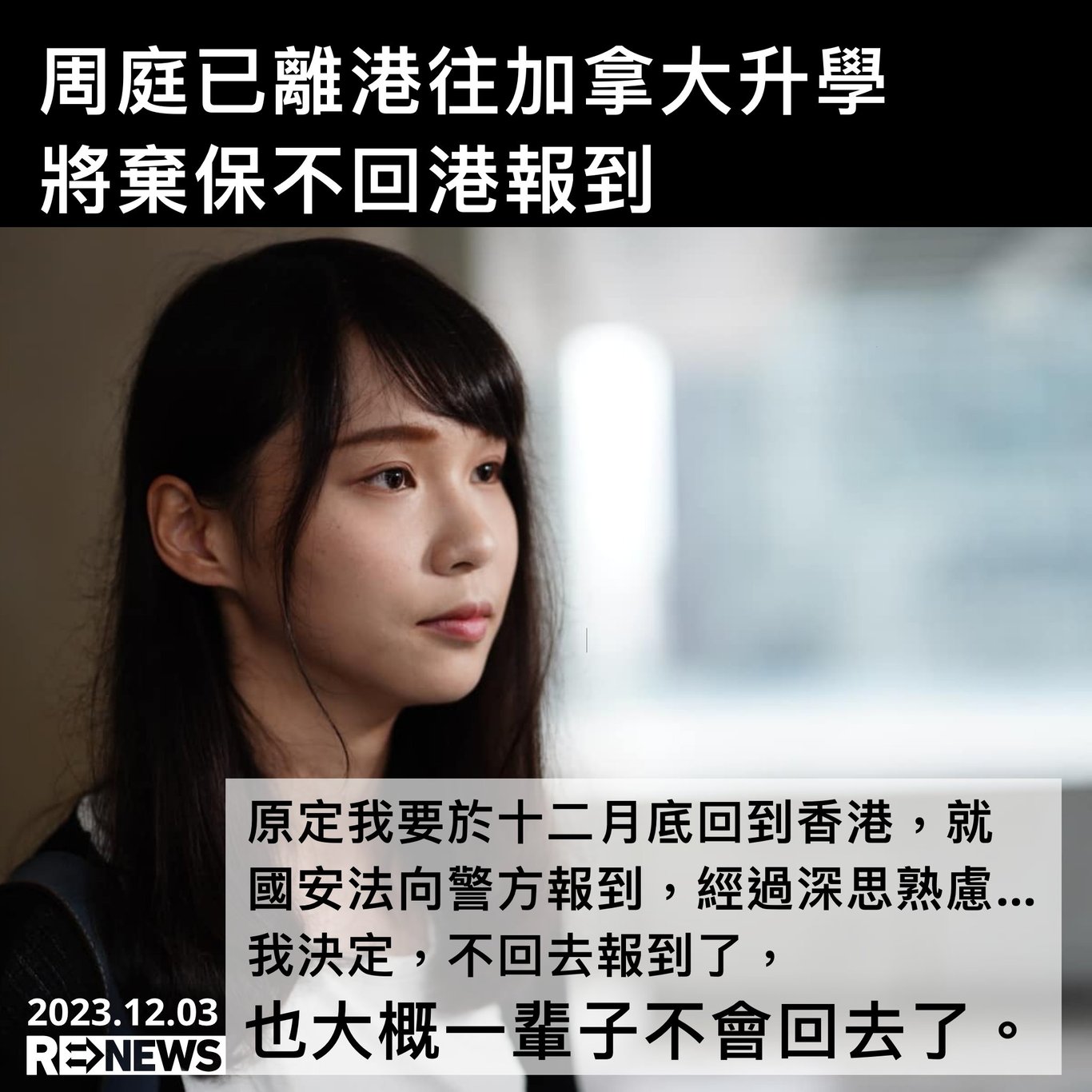 圖源:ReNews Facebook毫無懸念,周庭宣佈流亡成爲那天最大的新聞。