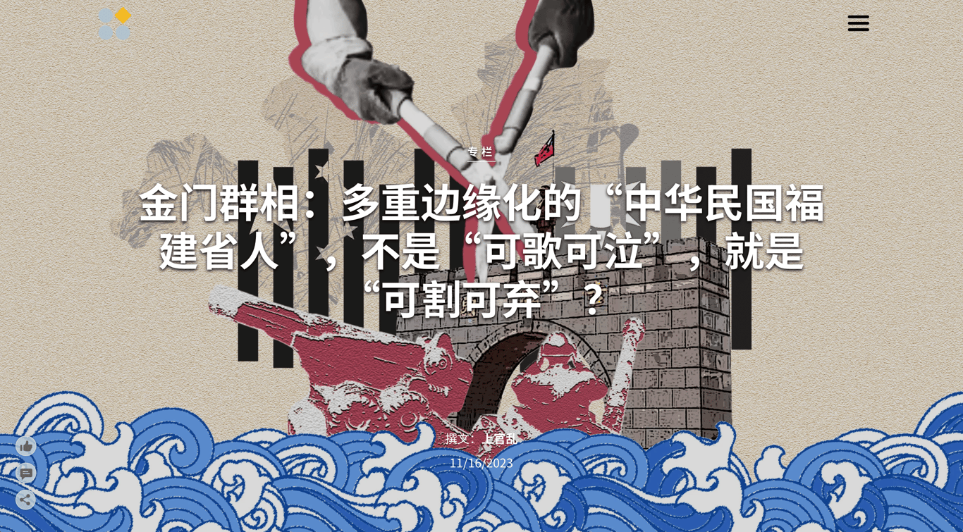 一位朋友告诉我,她的一位女性长辈朋友,过去曾在金门前线做医务人员,在大陆"单打双不打"中,她见到了无数硝烟和生离死别。可一回到台湾,发现大家歌舞升平,甚至很多人不知道金门还在被炮弹轰炸。她一个台湾人都感到自己被遗忘和忽视,更何况金门人?