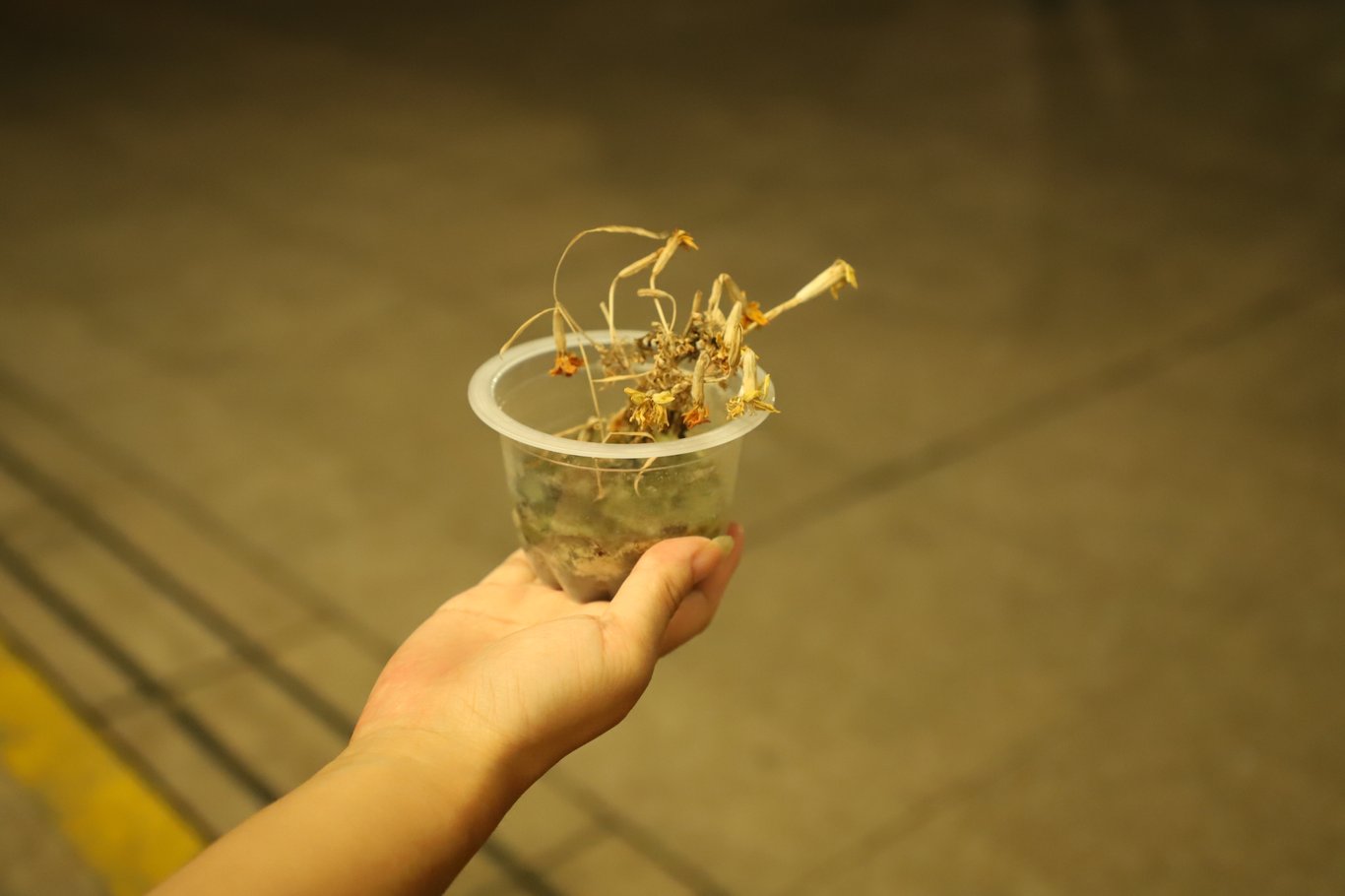 6月4日晚七点半,May手捧一盆枯死的花,站在维多利亚公园门口,低头不语。三岁的女儿一会儿扯扯她的裙角,一会儿抱着她的腿,抬头仰望肃穆沉默的妈妈。母女二人身着白色连衣裙,在清凉的晚风中,在徘徊的警察旁,在空荡昏暗的维园门口,静静地伫立良久,然后离去。