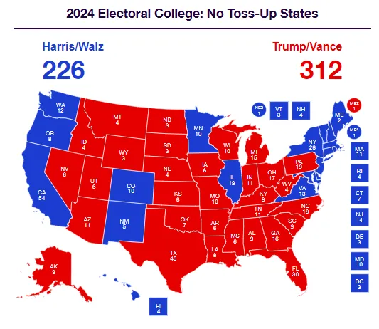 按照这个趋势发展的话,特朗普将在大选中取得压倒性的胜利。如下图。
