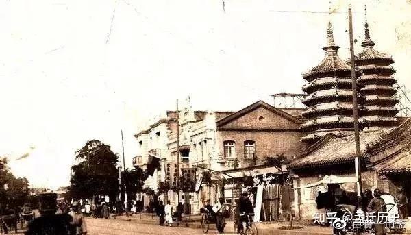 北京西长安街街景老照片。照片中右侧的双塔玲珑秀丽,相挽而立。这就是曾矗立在西长安街电报大楼位置的双塔庆寿寺。