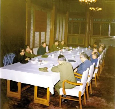 画面上方左起:江青、姚文元、华国锋、王洪文、汪东兴;对面坐着其他政治局委员 “散会后,大约是10日早上8点,我已下决心解决‘四人帮’的问题。我对汪东兴同志说,我身体不好,要去医院看病。