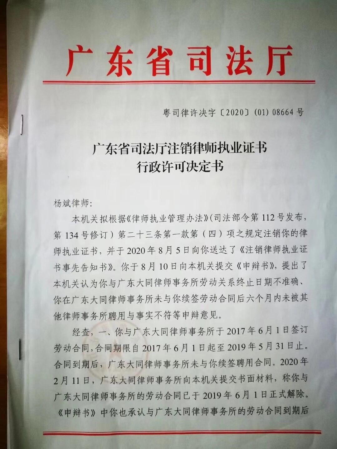 2020年8月,杨斌收到广东省司法厅的律师执照注销通知书。(图片来源:网络)