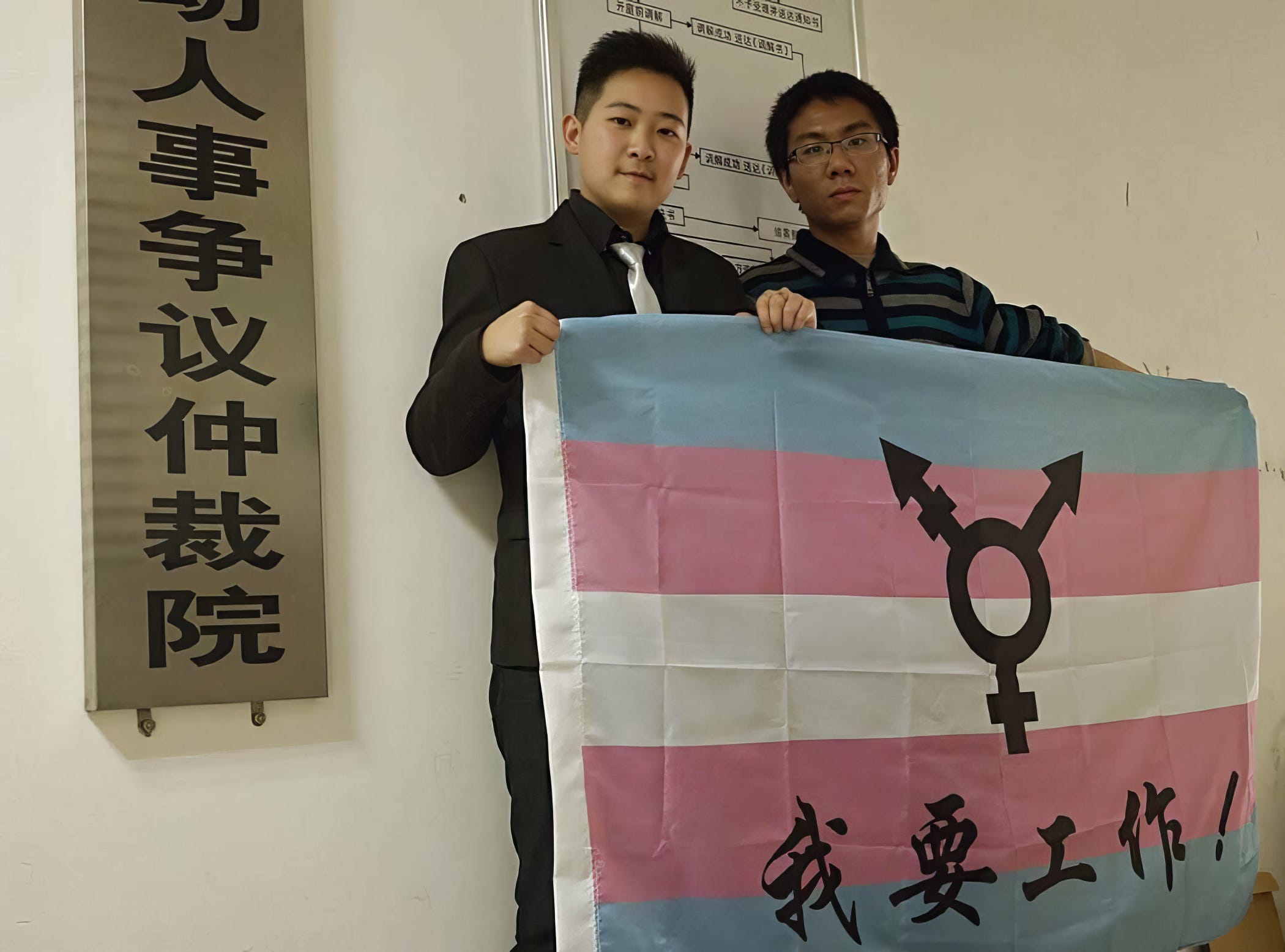 C先生(左)和律师黄沙(右)在贵阳市云岩区劳动人事争议仲裁院门口,拉起了跨性别旗,上面带有标语“我要工作”。(图片来源:Wang Dasi/纽约时报)