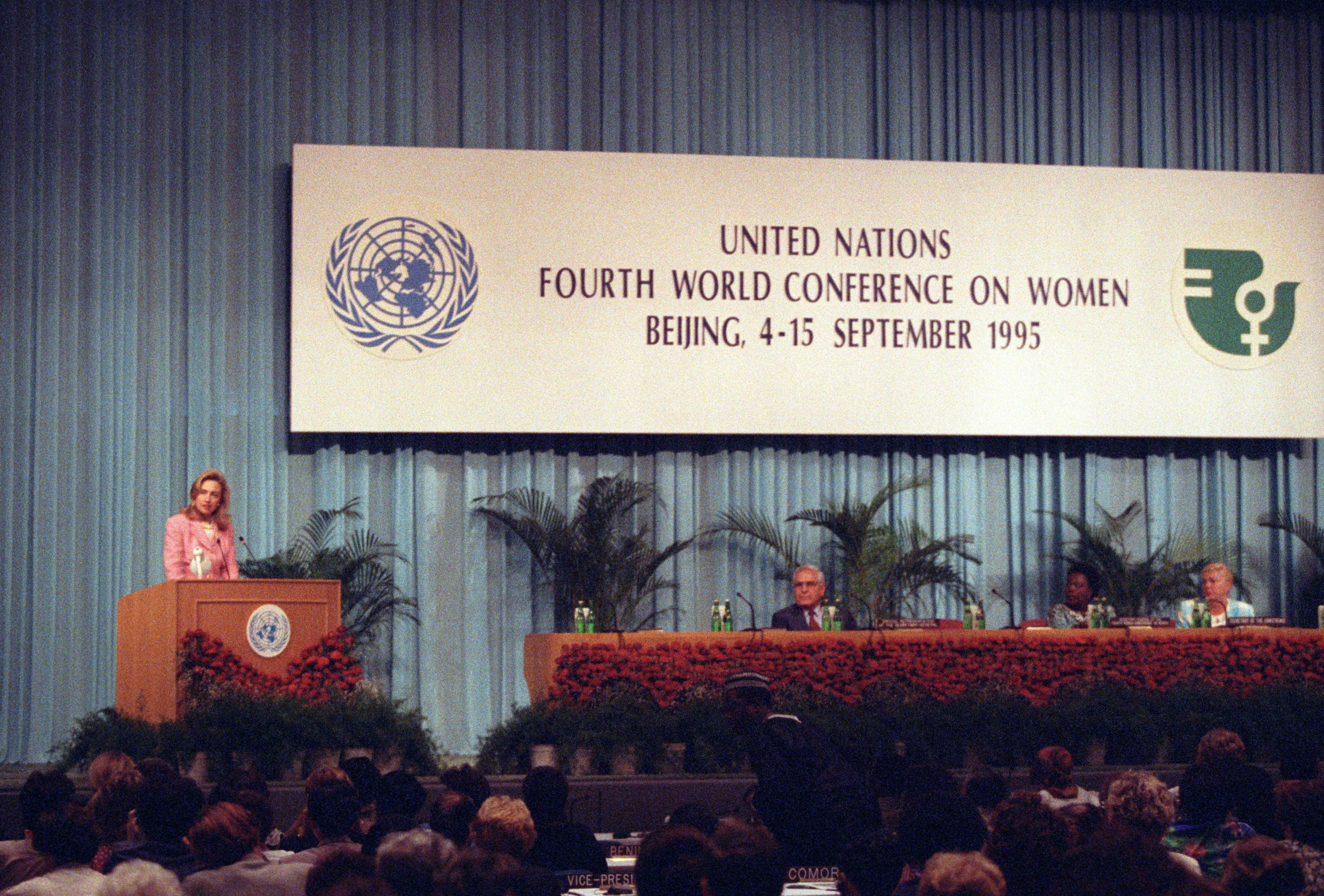 1995年9月5日,希拉里在联合国第四次世界妇女大会上发表了“女权即人权”的演讲。(图片来源:Sharon Farmer/White House Photograph Office)