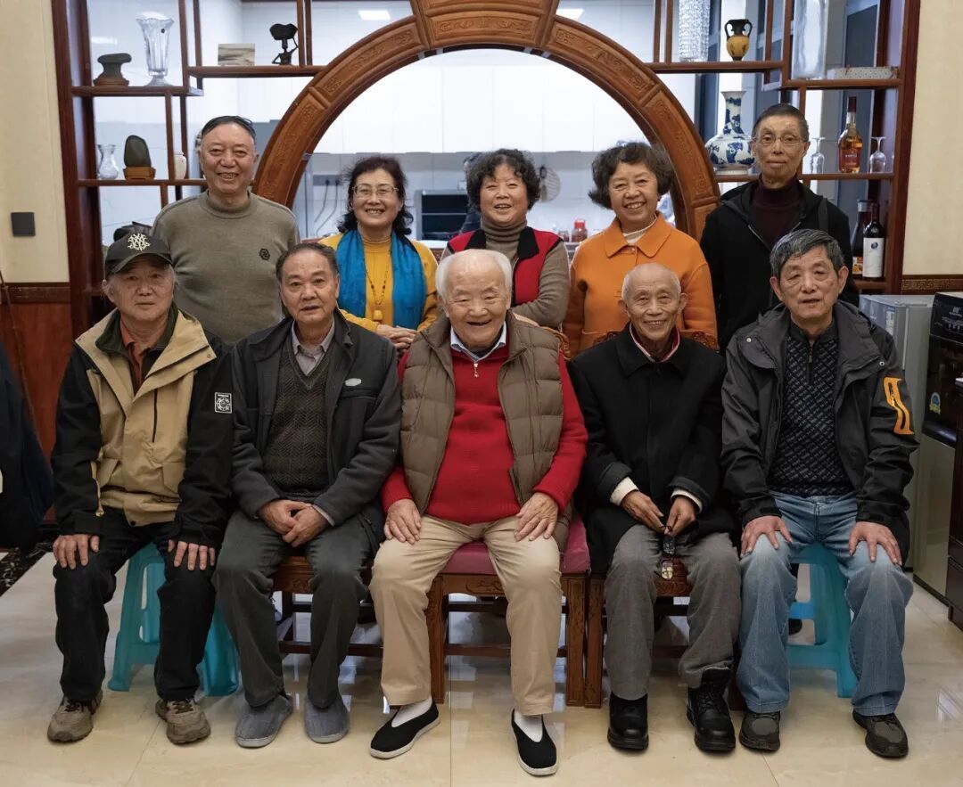 ▲2025年11月13日,钱理群与老友们合影,前排左起:贺坚、杜应国、钱理群、田制平、罗布龙;后排左起:刘丹伦、朱伟华、何幼、杨若敏、廖志强 图/南方人物周刊记者 大食